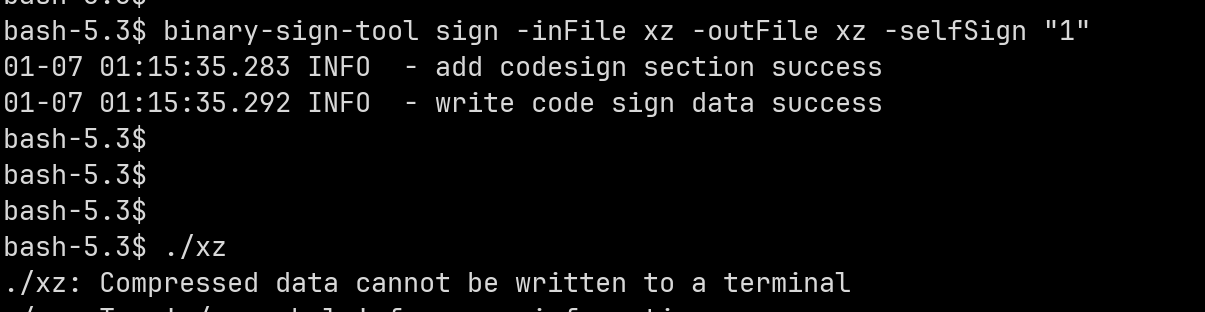 binary-sign-tool sign -inFile xz -outFile xz -selfSign "1"
