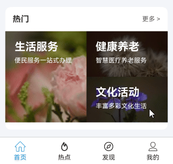 - 页面加载完成后,热门卡片中轮播图自动播放,切换时带有3D立方体旋转过渡效果。