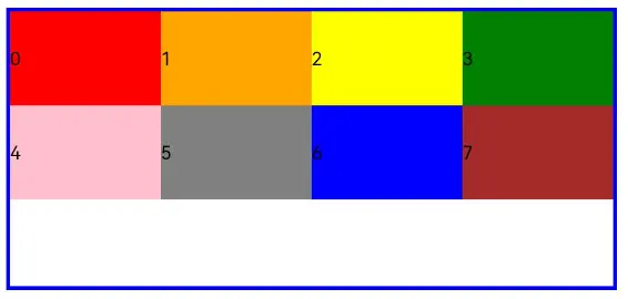 - 当columns为自定义值,栅格布局在任何尺寸设备下都被分为columns列。下面分别设置栅格布局列数为4和8,子元素默认占一列,效果如下: