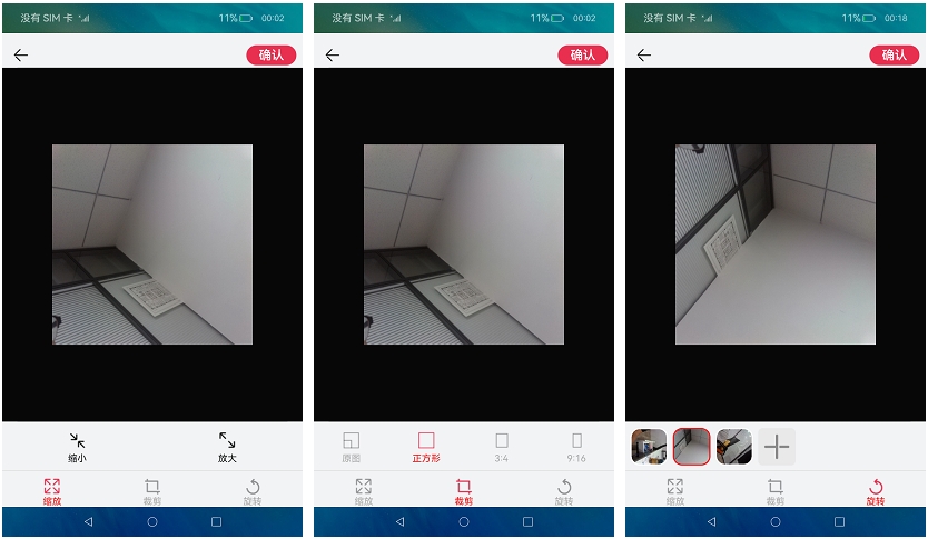 选中图片后点击下一步,页面会跳转到图片编辑页面,点击缩放,页面会显示缩小,放大按钮,点击按钮,可对图片进行缩小,放大操作。点击裁剪,页面会跳出裁剪比例,点击想要裁剪的比例可以对图片进行裁剪。点击旋转可对图片进行旋转。