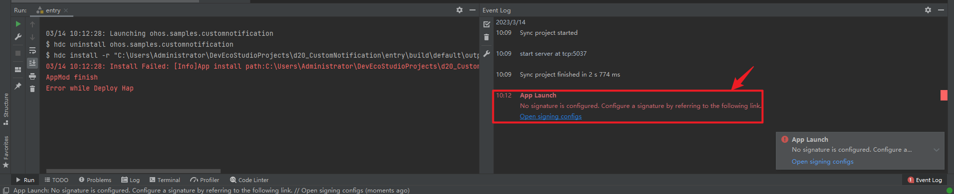 点击“entry”按钮,将项目程序安装到设备端。如下图所示: