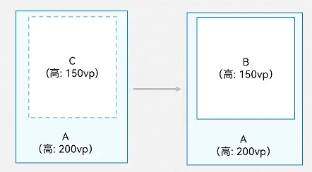 如下图所示,一个垂直列表B没有设置高度时,其父组件A高度为200vp,若其所有子组件C的高度总和为150vp,则此时列表B的高度为150vp。