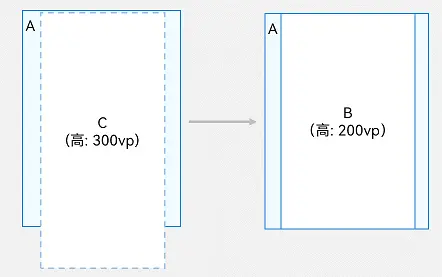 如下图所示,同样是没有设置高度的垂直列表B,其父组件A高度为200vp,若其所有子组件C的高度总和为300vp,则此时列表B的高度为200vp。