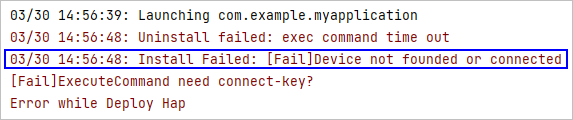 调试运行过程中,安装HAP失败,提示“Device not founded or connected”。