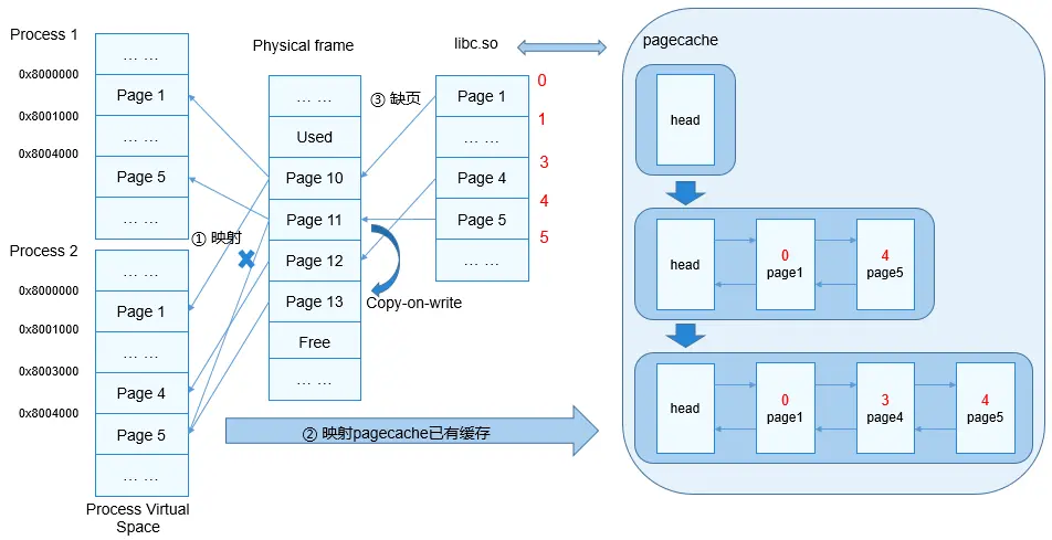 - 程序执行时,虚拟内存区间若无具体的物理内存做映射,系统将触发缺页中断,将elf文件内容读入物理内存,并将该内存块加入pagecache。