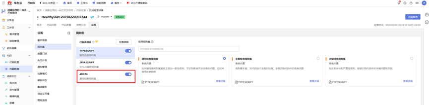 另一方面,在应用和元服务的构建、打包与批量发布过程中,缺乏统一、高效的平台支持,操作繁琐且容易出错。针对鸿蒙应用开发场景,我们联合华为HarmonyOS团队发布了最权威的代码检查规范,包括基于ArkTS语言的官方检查规则集,以及鸿蒙领域C/C++、JS、Python等多语言官方规则集。为了解决上述问题,CodeArts软件开发生产线上线了全新功能,提供了鸿蒙应用开发能力,覆盖代码托管、代码检查、编