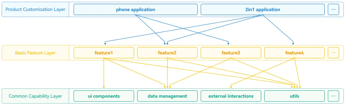 - 分层架构设计:将应用划分为产品定制层、基础特性层和公共能力层,可以降低层间的依赖性,从而提升代码的可维护性。通过分层架构设计进一步明确了每层的职责和层间的交互机制,为开发者呈现了一个清晰且结构化的开发框架。
