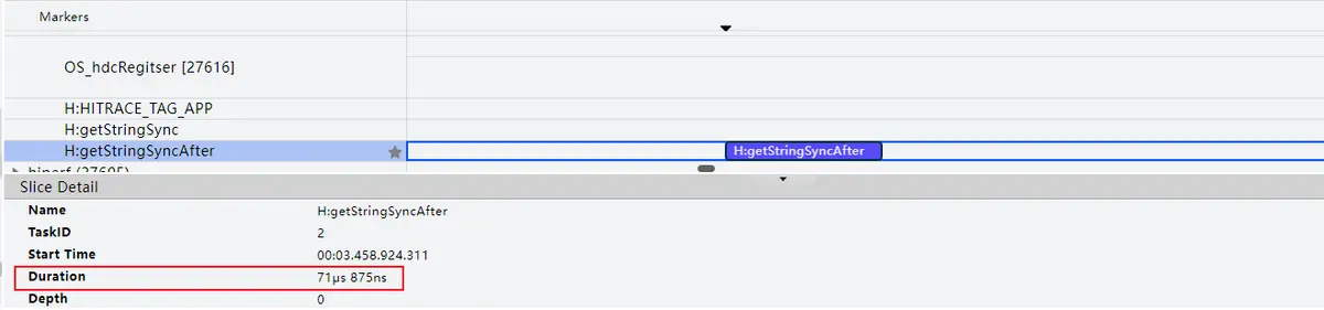可以通过 冷启动分析:Launch分析 工具抓取Trace,根据hiTraceMeter性能打点,查看耗时为0.071ms。