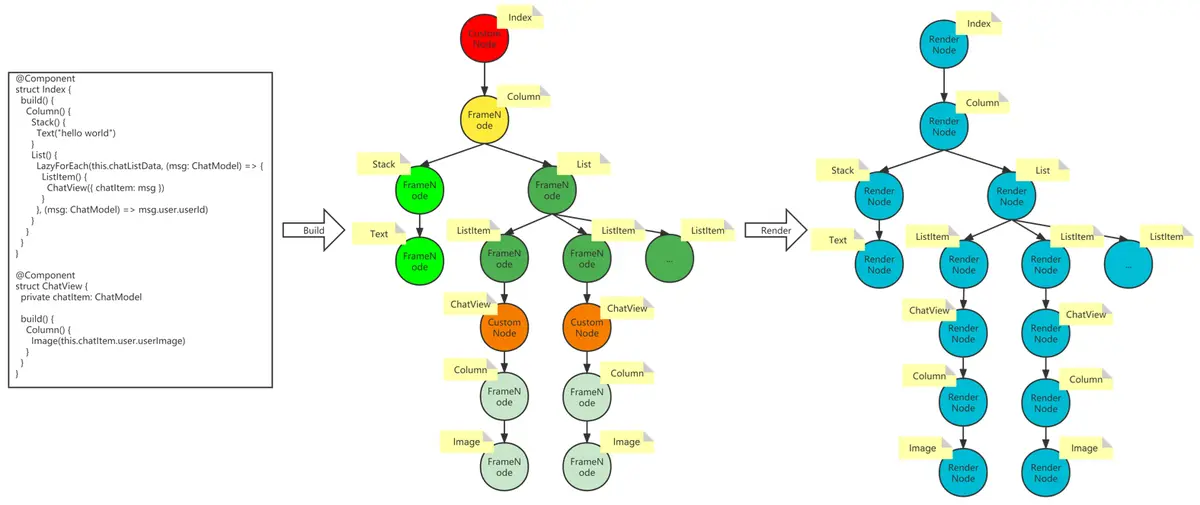 在ArkUI中使用自定义组件时,在build阶段将在后端FrameNode树创建一个相应的CustomNode节点,在渲染阶段时也会创建对应的RenderNode节点,如下图所示。