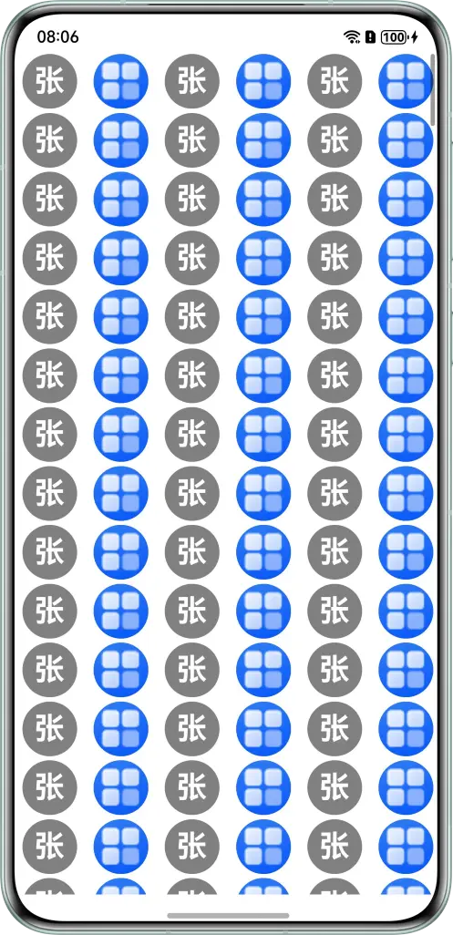 以一个简单的公共头像组件为例演示AttributeModifier方案的性能收益。公共头像组件要求对于有用户头像的数据,界面展示用户头像图片。对于没有用户头像的数据,界面展示灰色背景和用户名的第一个字符。现列表展示1000个头像组件,界面效果如下: