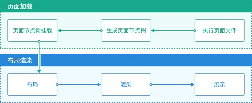 应用启动到UI页面展示过程包含框架初始化、页面加载和布局渲染三个步骤。其中页面加载和布局渲染的主要流程如下: