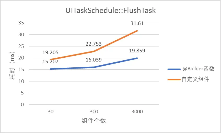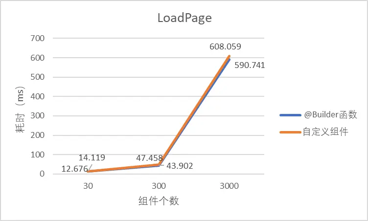 将组件数量从30个递增到3000个,通过profiler获取页面加载标签PageRouterManager::LoadPage和页面UI刷新任务标签UITaskScheduler::FlushTask的耗时,对比两种方案的耗时如下: