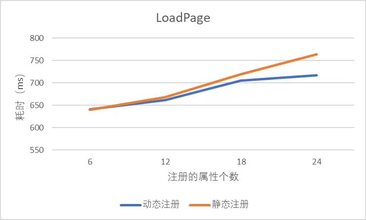 图4 静态注册属性和动态注册属性在不同属性数量下LoadPage耗时