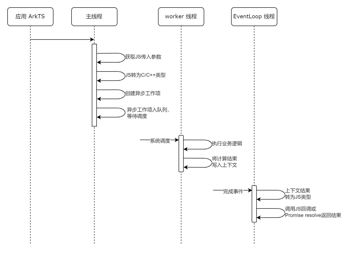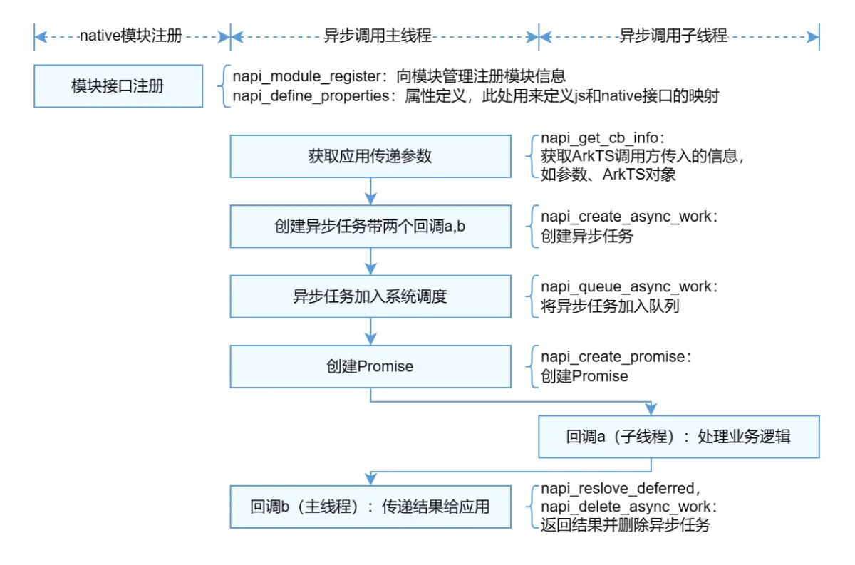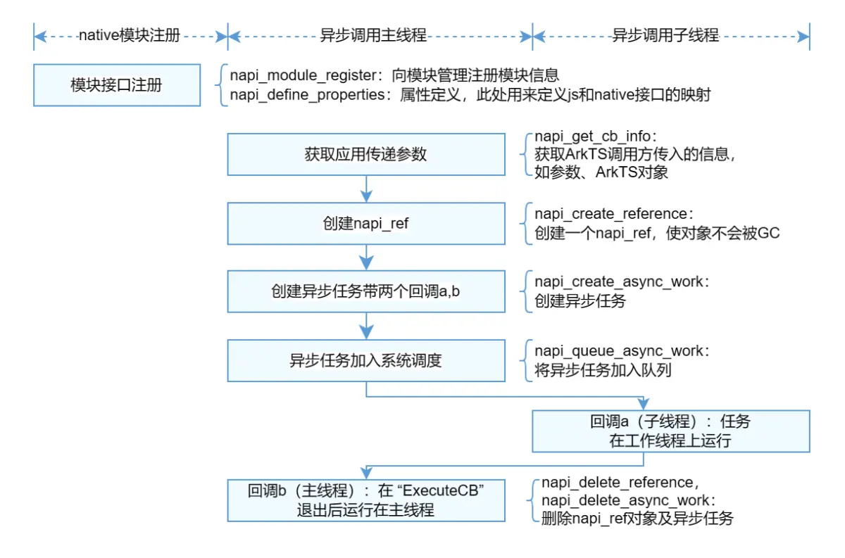 - 使用napi_create_async_work创建异步任务,并使用napi_queue_async_work将异步任务加入队列,等待执行。