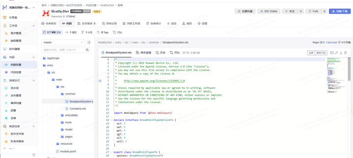 华为云代码托管服务CodeArts Repo基于Git提供分布式代码管理和协同能力,内置华为公司的代码提交规范、代码合并等多项代码管理规则,保证代码开发和管理的安全可信。针对鸿蒙应用开发场景,我们新增了ArkTS类型源代码文件托管,支持.ets文件的关键字的高亮显示和渲染。