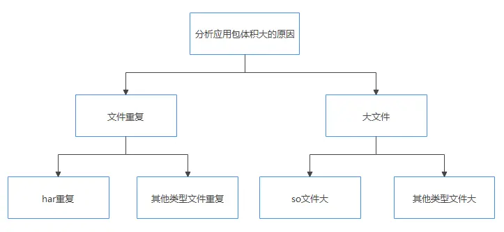 应用包体积大小也是应用体验的一个重要指标,体积过大会严重影响应用下载安装体验,且会占用较大的设备空间,因此包体积过大的应用会有包体积优化的诉求。想要优化应用包体积首先要分析应用包体积大的原因,一般包体积大的原因可以分为文件重复、大文件两大类,其中文件重复Har重复和其他类型文件重复,大文件可以分为so文件大和其他类型文件大,针对不同的原因有针对性的优化方案。