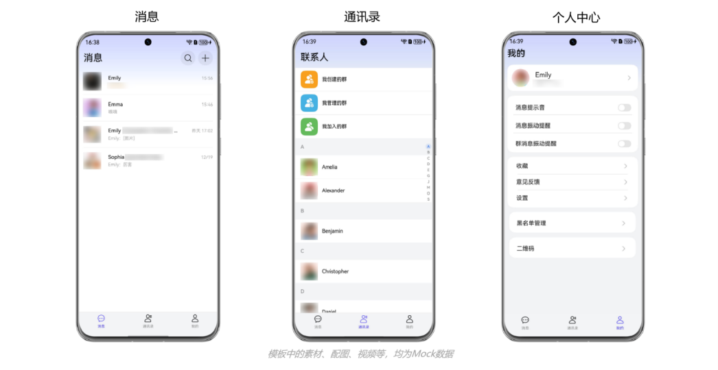 本模板为社交交友类应用提供了常用功能的开发样例,模板主要分消息、通讯录和个人中心三大模块。模板已集成华为账号、腾讯云即时通信IM、地图展示、麦克风语音录制、视频图片等相机拍照服务,支持深色模式、适老化、无障碍等特性,提供完整的社交应用解决方案,只需做少量配置和定制即可快速实现社交应用的核心功能。