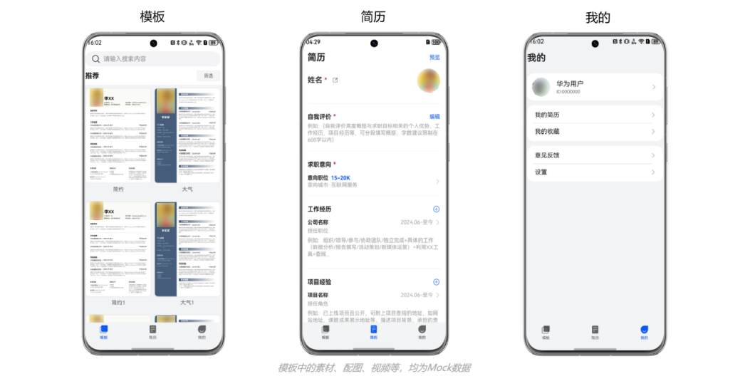 本模板为求职类应用提供了常用功能的开发样例,模板主要分模板、简历和我的三大模块。模板已集成华为账号、微信登录、应用更新检查、意见反馈等服务,只需做少量配置和定制即可快速实现简历应用的核心功能。