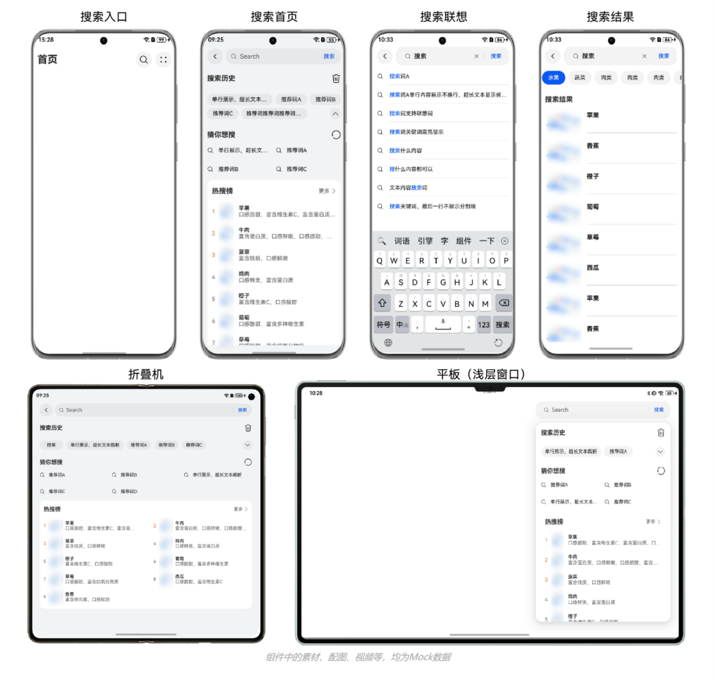 本组件提供了搜索功能,包括搜索历史,可选的猜你想搜和热搜榜,搜索联想,搜索结果,支持一多适配,平板提供可选的浅层窗口模式。