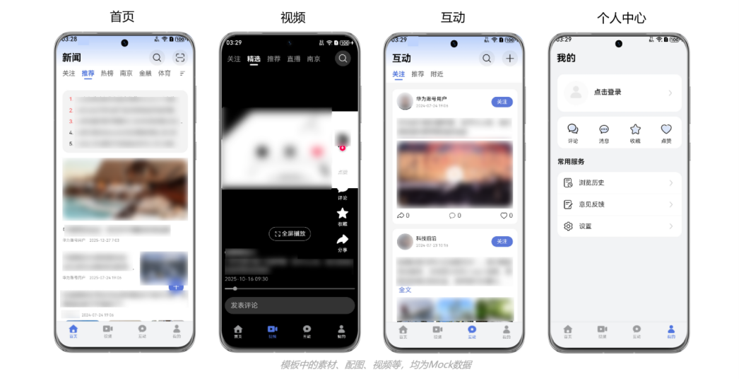 本模板为新闻资讯类应用提供了完整的开发框架,采用 Vue 3 + uni-app 技术栈开发。模板主要分首页、视频、互动和个人中心四大模块。模板已集成华为账号、微信分享等服务,支持字体大小调整、网络设置等特性,提供完整的新闻资讯应用解决方案,只需做少量配置和定制即可快速实现新闻应用的核心功能。
