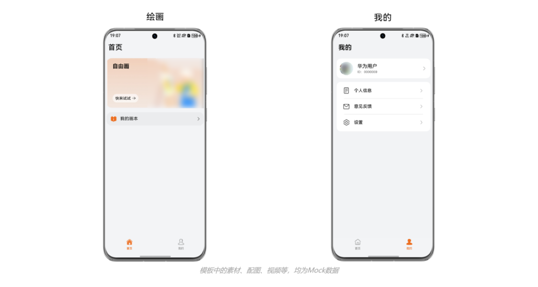 本模板为绘画类应用提供了常用功能的开发样例,模板主要分绘画和我的两大模块。模板已集成华为账号、微信登录、应用更新检查、意见反馈等服务,只需做少量配置和定制即可快速实现绘画应用的核心功能。