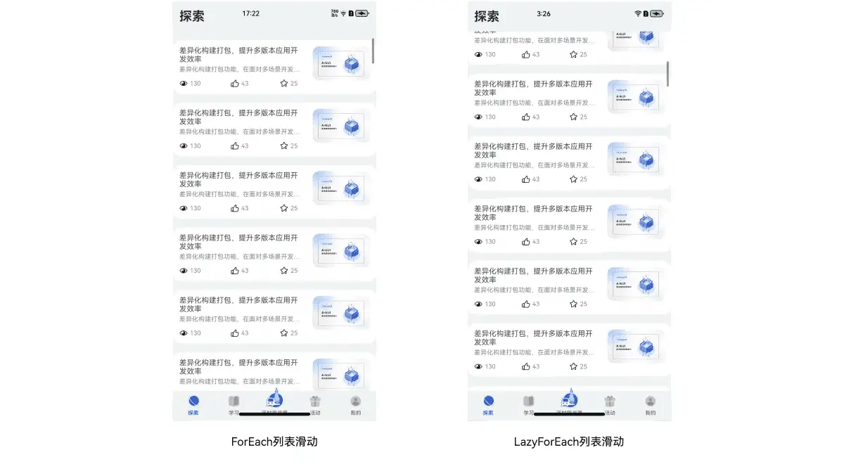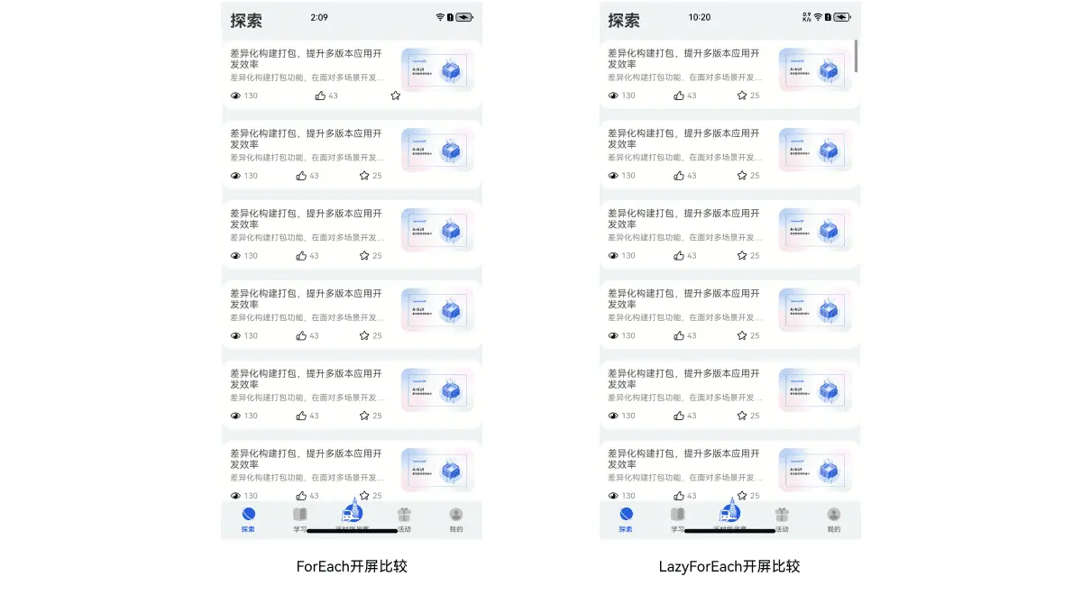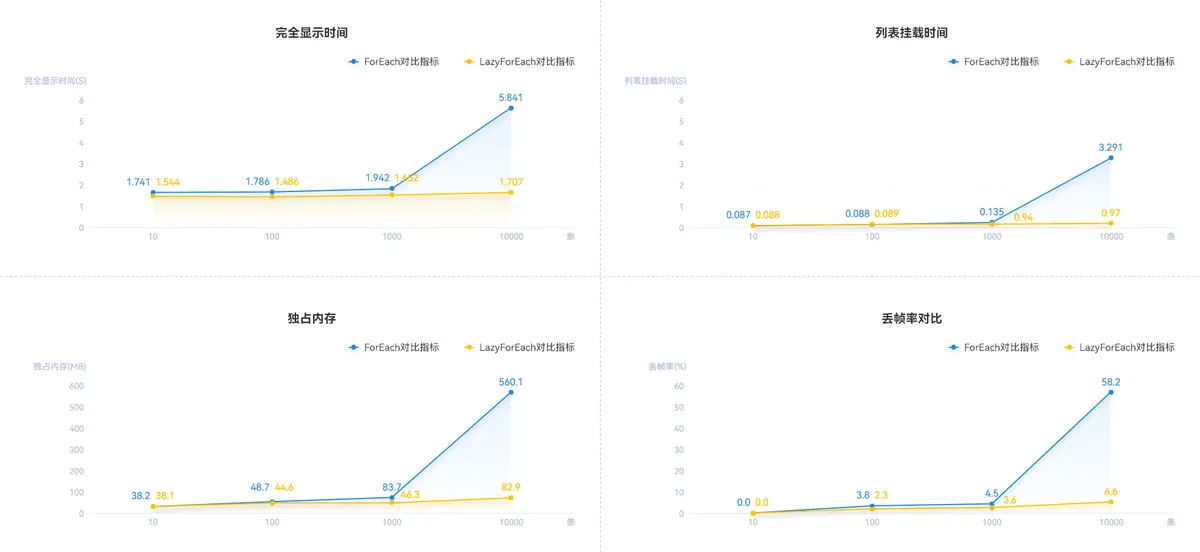 测试表明,使用LazyForEach懒加载这项技术后,相比ForEach这种加载方式,在列表数据量较小(100条内)且数据一次性全量加载不是性能瓶颈时,两者各项性能指标差异不大。但当列表数据较长特别是达到10000条数据量后,ForEach的各项性能指标会有“指数级别”的显著劣化,滑动会出现明显的卡顿,甚至会出现应用crash等现象;而LazyForEach因为采用了懒加载、缓存列表项、组件复用等技术后,能明显减少首屏完全显示所用时间,降低应用的独占内存,提高页面滑动帧率,带来更好的性能。其对比效果如下所示: