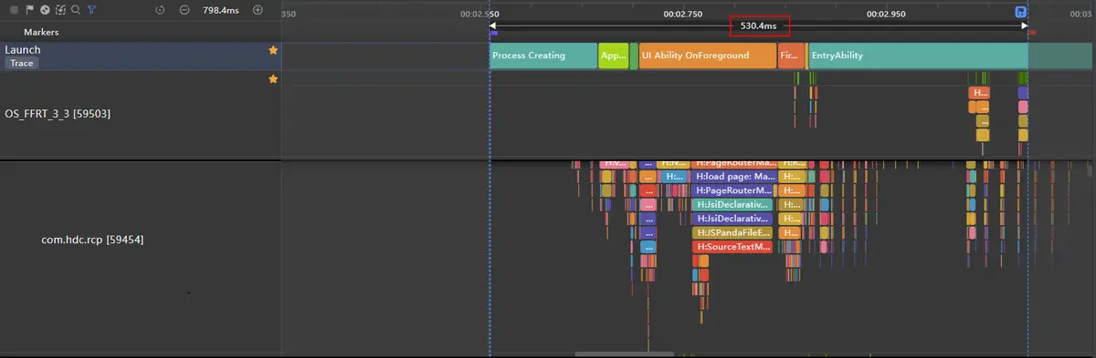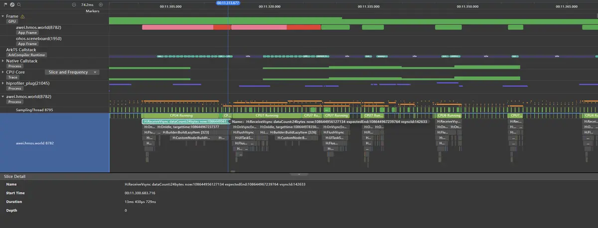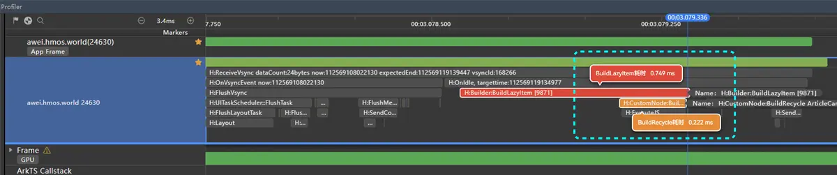 图中红色区域出现了丢帧,这是因为缓存区中的最上面的一个ListItem渲染到页面上时,会执行BuildLazyItem操作,此部分会耗时10.277ms,导致本帧总体耗时达到了13.430ms,超过了11.1ms而丢帧。