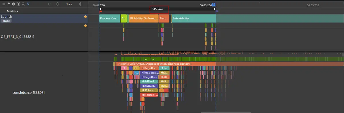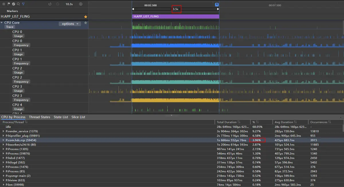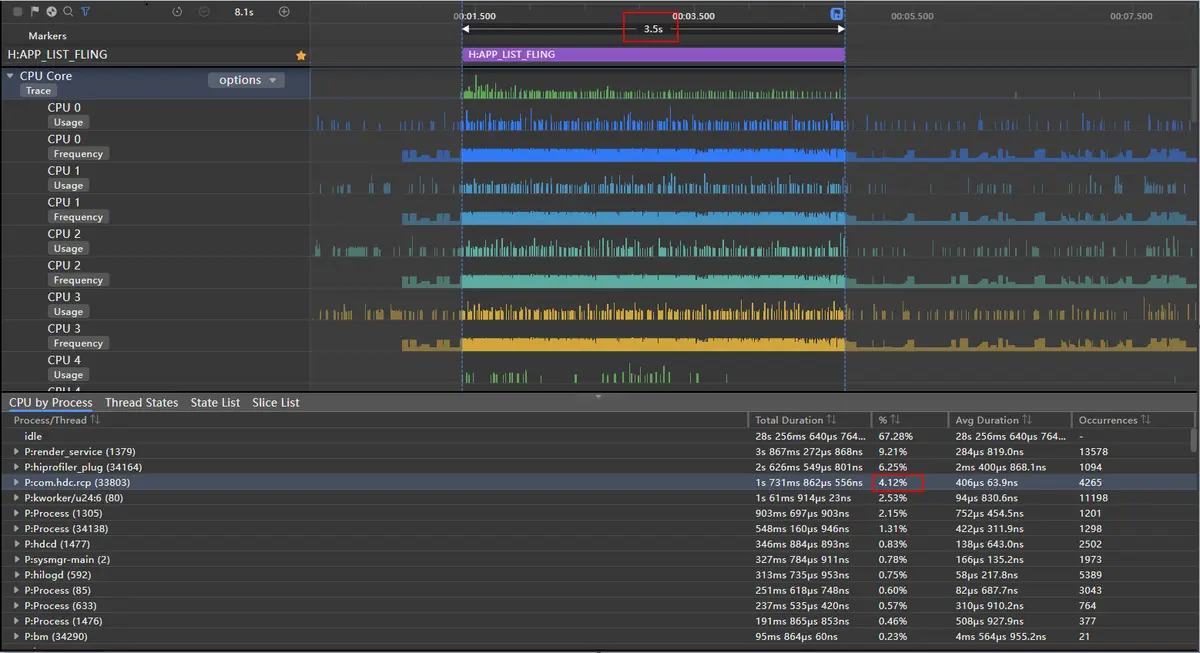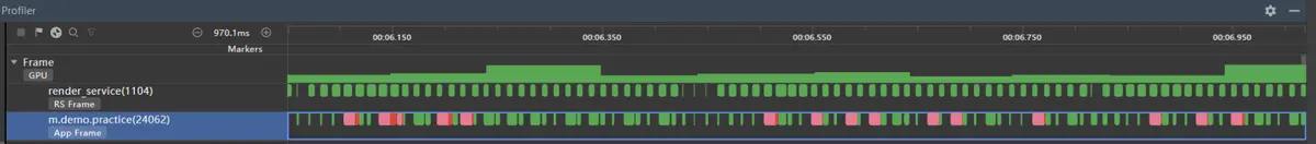 上图中列表快速滑动了15.8s,泳道中全是绿色表示无丢帧出现,丢帧率为0%。对其中某一帧放大分析,得到如下图: