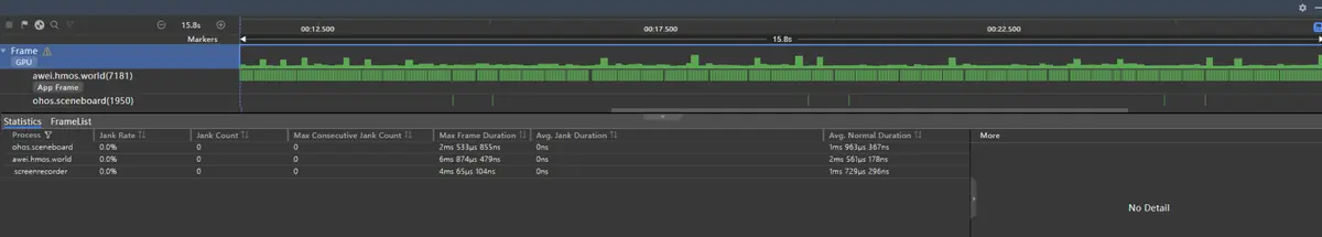 可以发现之前的丢帧情况得到明显缓解,从图19可以看出,列表滑动时(15.8s的区间段内)都是绿色,丢帧率为0%,不会出现图16中“有规律、且重复”的红色丢帧情况。这是因为,List列表开启了组件复用,不会执行BuildLazyItem这个耗时操作(耗时10.277ms),后续创建新组件节点时,会直接复用缓存区中的节点(耗时0.97ms),这样就大幅节约了组件重新创建的时间。
