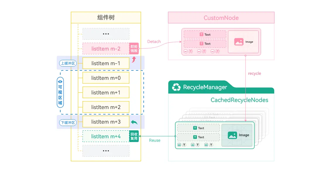 - RecycleManager是一种用于优化资源利用的回收管理器。当一个数据项滚出屏幕时,不会立即销毁对应的视图对象,而是将该视图对象放入复用池中。当新的数据项需要在屏幕上展示时,RecycleManager会从复用池中取出一个已经存在的视图对象,并将新的数据绑定到该视图上,从而避免频繁的创建和销毁过程。通过使用RecycleManager,可以大大减少创建和销毁视图的次数,提高列表的滚动流畅度和性能表现。