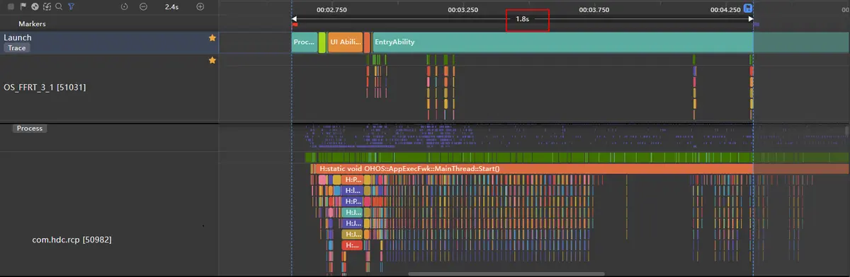 从图中可以看见,泳道中红色和绿色间隔出现,其中红色区域表示丢帧,绿色表示正常,对红色丢帧区域进行耗时分析: