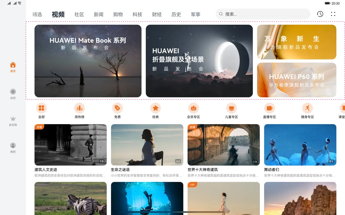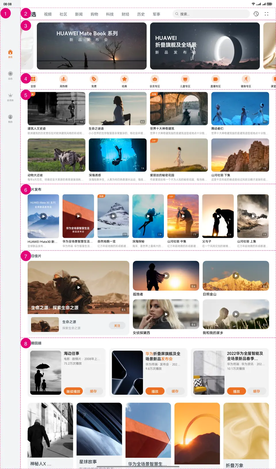 长视频应用首页主要发挥推荐精选视频的作用,解决用户想要看视频的核心需求,所以首页内容都围绕这一功能设计。观察首页在2in1上的UX设计图,可以进行如下设计(图中为包括可滑动区域的内容):