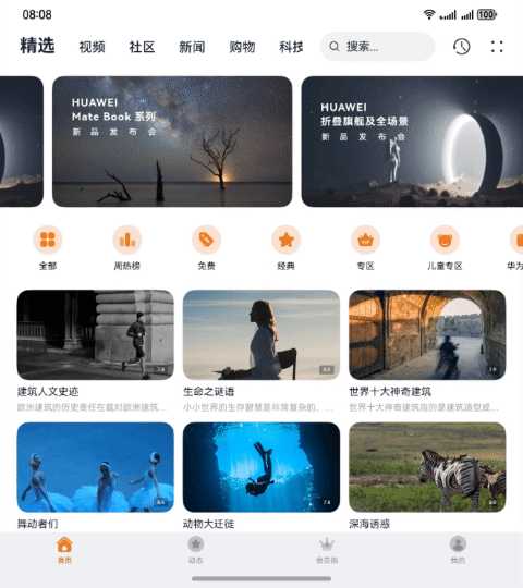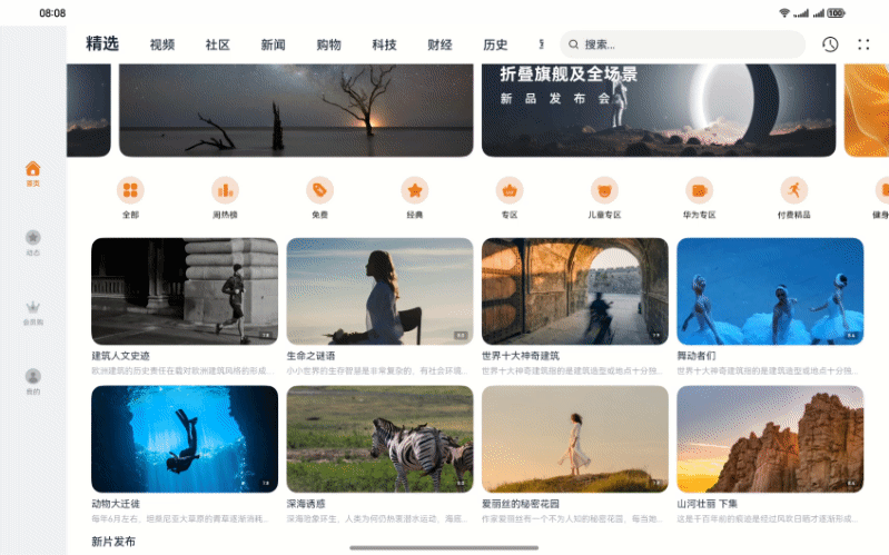 在md和lg断点下,首页的推荐视频区域支持双指捏合放大与缩小。网格布局在md断点下默认3列显示,两指向中心捏合切换为4列显示,两指向外放大切换为3列显示;lg断点下,4列、5列显示同理。这一效果通过在 PinchGesture 双指触发捏合手势中动态修改网格布局的columnsTemplate属性实现。