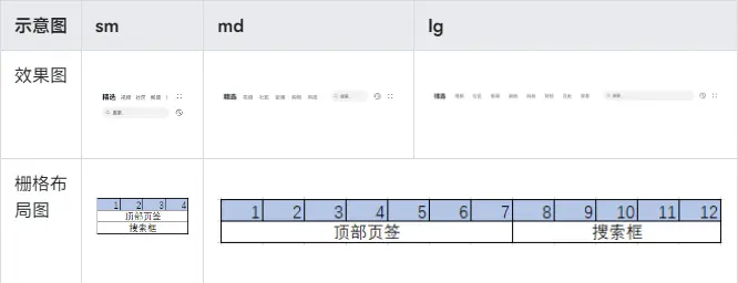 不同断点下,顶部页签和搜索框占用不同栅格列数,使用栅格布局实现在sm断点下分两行显示,在md和lg断点下单行显示。根据设计将栅格在sm、md和lg的断点上分别划分为4列、12列、12列。示意图如下:
