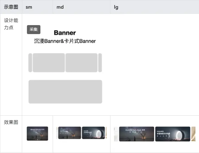 Banner图和图标列表区域,均使用Swiper组件,设置在不同断点下的displayCount属性来实现自适应布局的延伸能力,本章节以Banner图区域作为示例,图标列表的实现读者可以自行查看代码。Banner图区域中,Banner展示数量在sm断点下为1,并显示导航点指示器;在md和lg断点下Banner为2,且前后边距展示前后两张Banner图的部分内容。