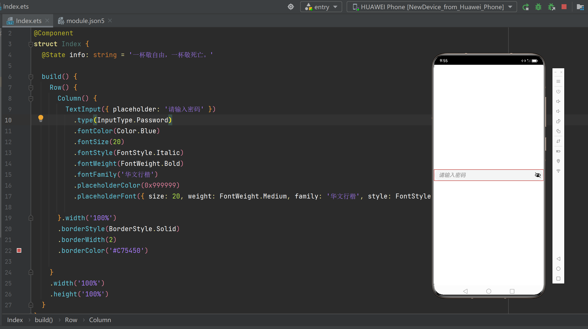 TextInput组件用于输入单行文本,响应输入事件。TextInput的使用也非常广泛,例如应用登录账号密码、发送消息等。和Text组件一样,TextInput组件也支持文本样式设置,下面的示例代码实现了一个简单的输入框: