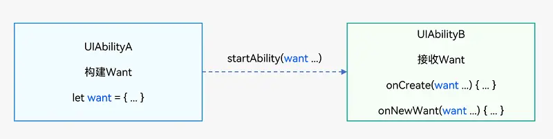Want是一种对象,用于在应用组件之间传递信息。其中,一种常见的使用场景是作为startAbility()方法的参数。例如,当UIAbilityA需要启动UIAbilityB并向UIAbilityB传递一些数据时,可以使用Want作为一个载体,将数据传递给UIAbilityB。图1Want用法示意。