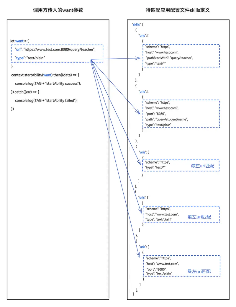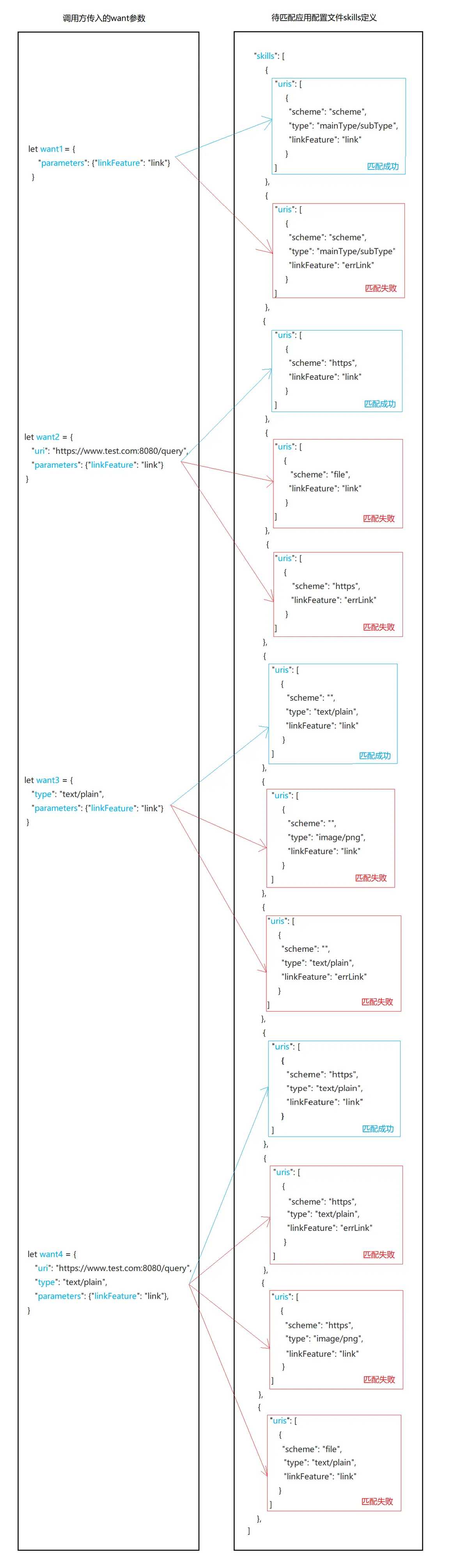 调用方传入的want参数中设置uri和type参数发起启动应用组件的请求,系统会遍历当前系统已安装的组件列表,并逐个匹配待匹配应用组件的skills配置中的uris数组,如果待匹配应用组件的skills配置中的uris数组中只要有一个可以匹配调用方传入的want参数中设置的uri和type即为匹配成功。