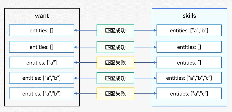 - 调用方传入的want参数的entities不为空,待匹配应用组件的skills配置中的entities不为空且包含调用方传入的want参数的entities,则entities匹配成功。