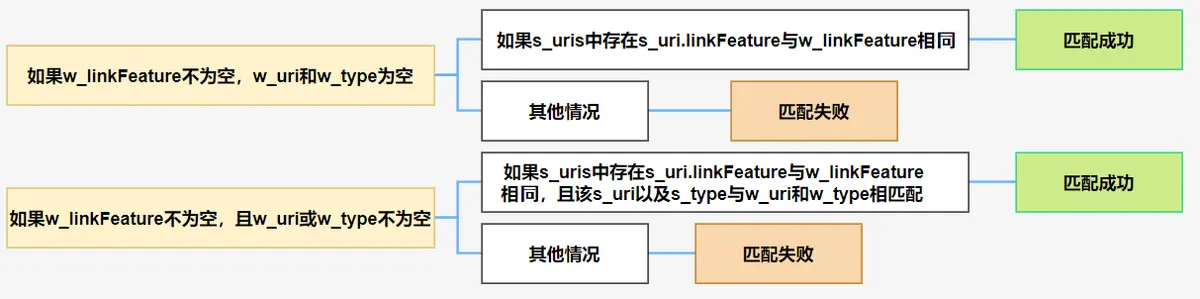 - want参数的uri和type均为空, 只匹配linkFeature,当w_linkFeature和s_uri的linkFeature相同时匹配成功,否则匹配失败。