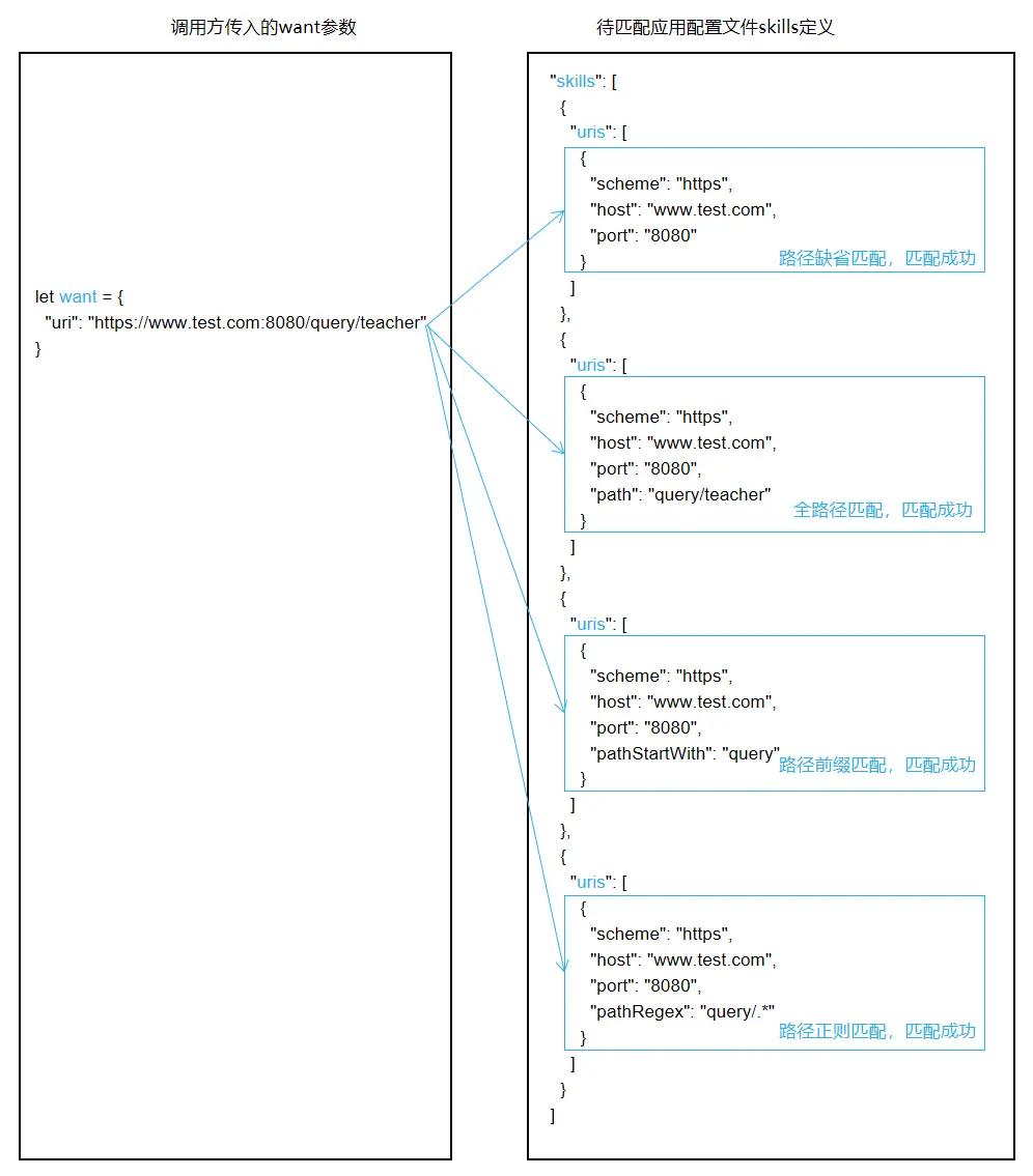 - 如果待匹配应用组件的skills配置中的uris数组为空,匹配成功。
