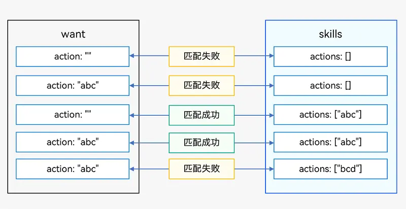 - 调用方传入的want参数的action不为空,待匹配应用组件的skills配置中的actions不为空且不包含调用方传入的want参数的action,则action匹配失败。