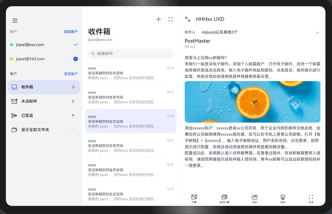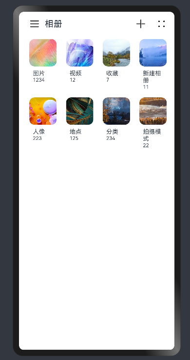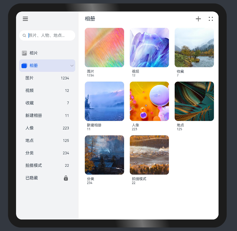 ├──entry/src/main/ets // 代码区 │ ├──application │ │ ├──MailBox.ets // 邮箱 │ │ ├──PhotoAlbum.ets // 图库 │ │ └──Settings.ets // 设置 │ ├──common │ │ ├──BreakpointSystem.ets // 媒体查询 │ │ ├──MailContent.ets // 邮箱详情 │ │ ├──MailNavigation.ets // 邮箱导航 │ │ ├──MailSideBar.ets // 邮箱侧边栏 │ │ ├──PhotoContent.ets // 图库详情 │ │ ├──PhotoSideBar.ets // 图库侧边栏 │ │ ├──SettingItem.ets // setting设置项 │ │ └──WlanItem.ets // Wlan详情页 │ ├──entryability │ │ └──EntryAbility.ets │ ├──model │ │ └──dataType.ets // 侧边栏菜单数据类型 │ └──pages │ └──Index.ets // 首页 └──entry/src/main/resources // 应用资源目录