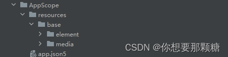 在AppScope,其中有resources文件夹和配置文件app.json5。AppScope>resources>base中包含element和media两个文件夹,