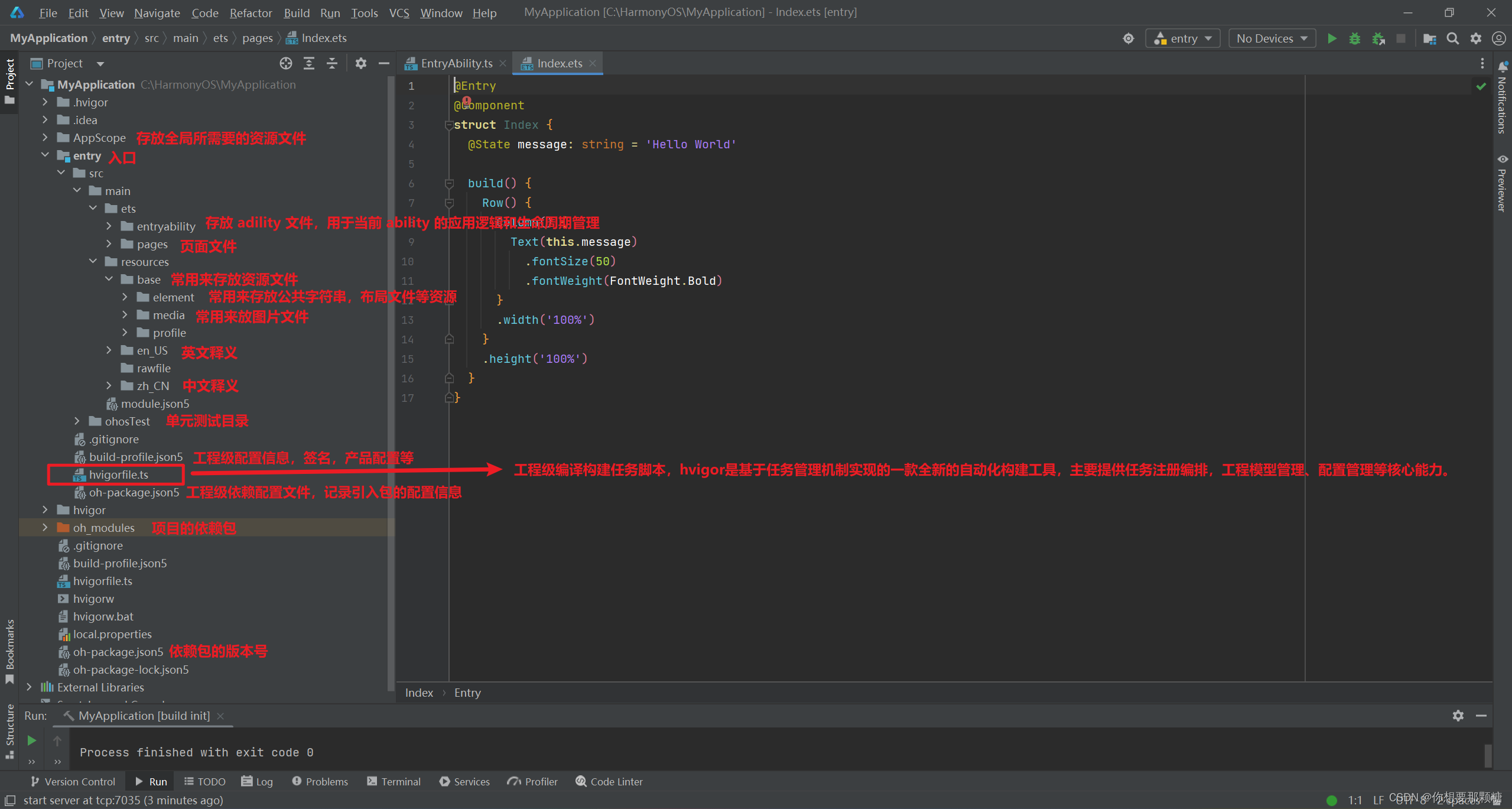 - hvigorfile.ts是工程级编译构建任务脚本,hvigor是基于任务管理机制实现的一款全新的自动化构建工具,主要提供任务注册编排,工程模型管理、配置管理等核心能力。