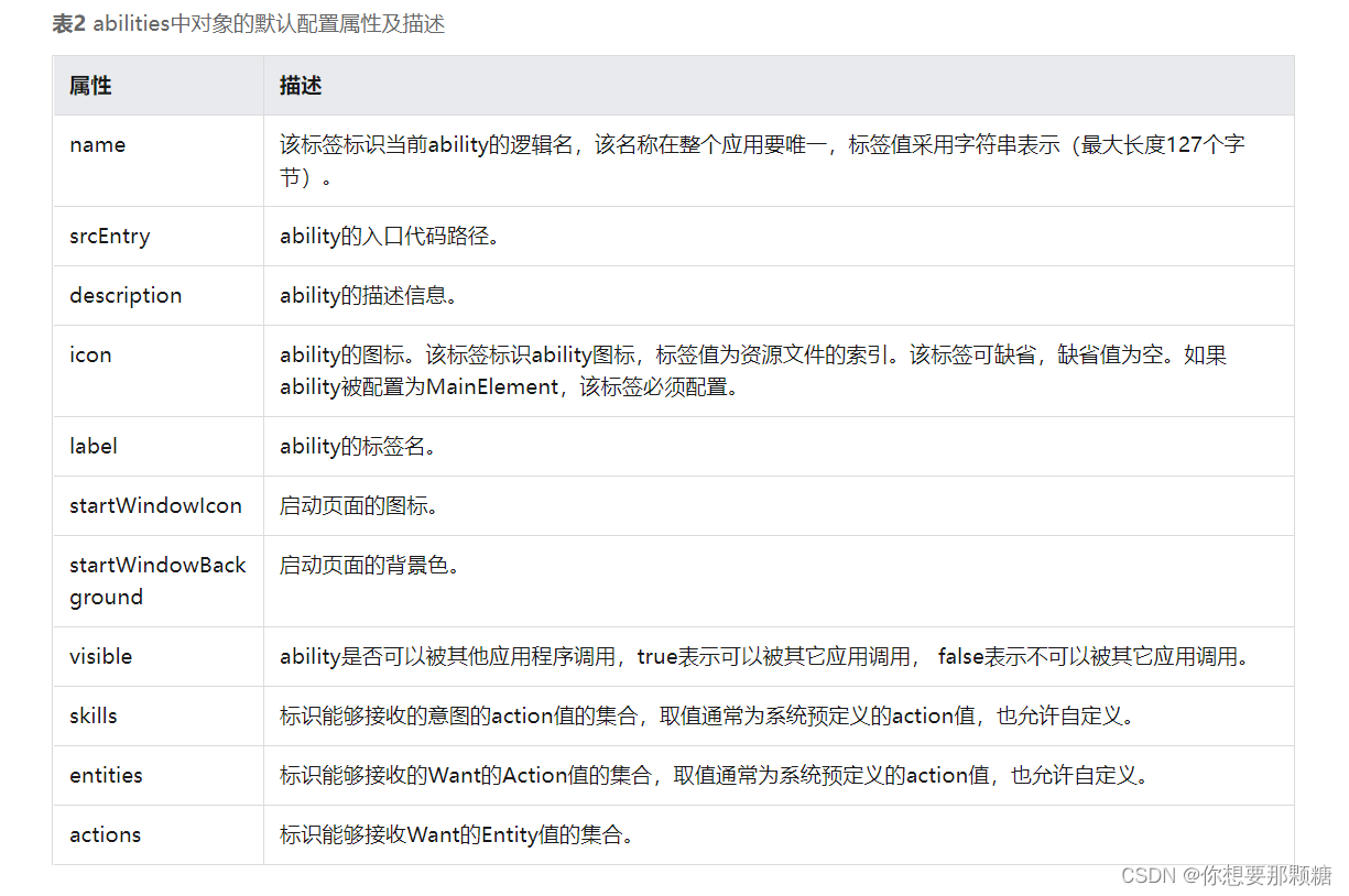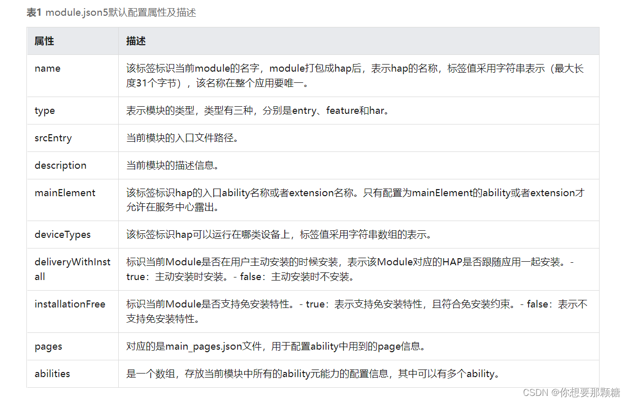其中module对应的是模块的配置信息,一个模块对应一个打包后的hap包,hap包全称是HarmonyOS Ability Package,其中包含了ability、第三方库、资源和配置文件。其具体属性及其描述可以参照下表1。