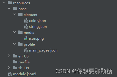 resources目录下存放模块公共的多媒体、字符串及布局文件等资源,分别存放在element、media文件夹中。