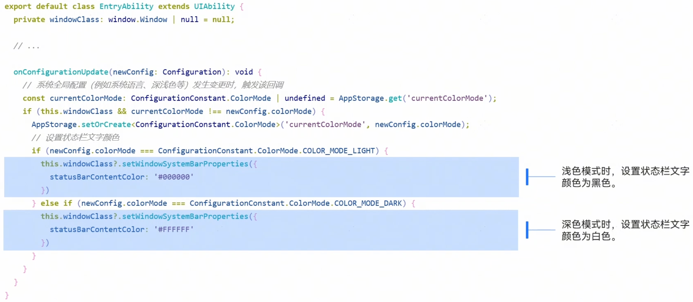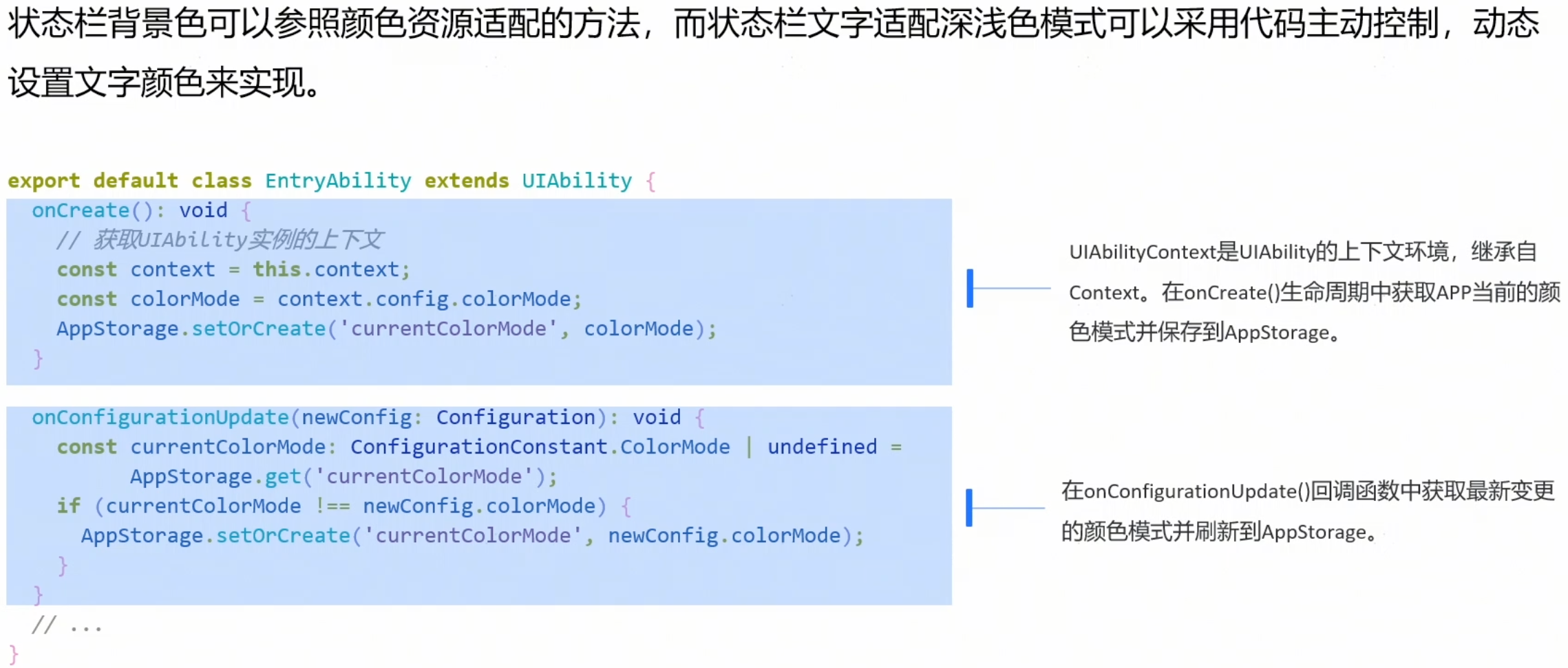 - 在EntryAbility中获取并维护当前深浅色状态,在onCreate时将当前colorMode放在AppStorage中,并在系统环境变量发生变化会触发的onConfigurationUpdate()回调中动态更新深浅色状态。