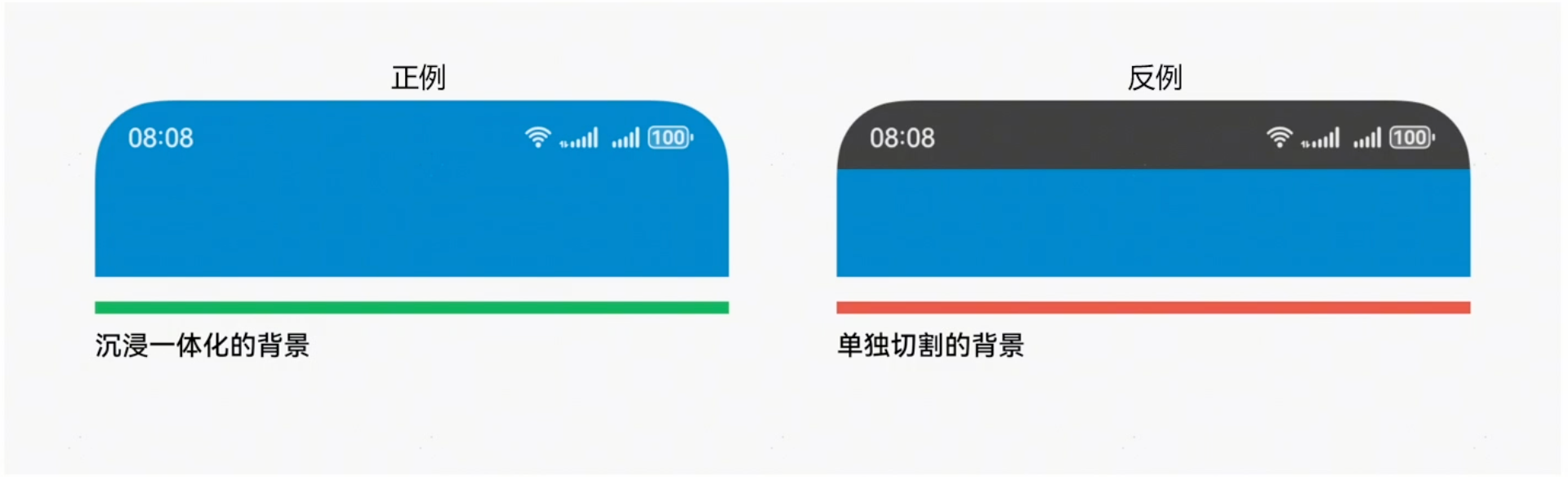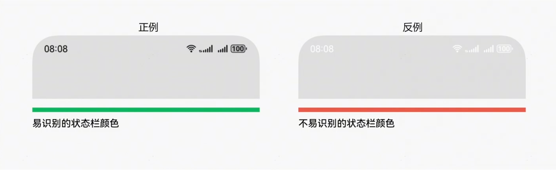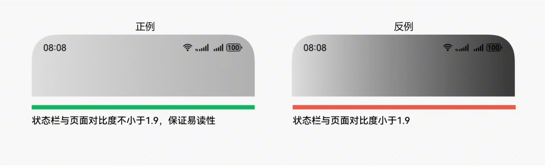避免在状态栏背景区域内采用左右半区对比差异过大的颜色,导致部分状态栏信息无法阅读。