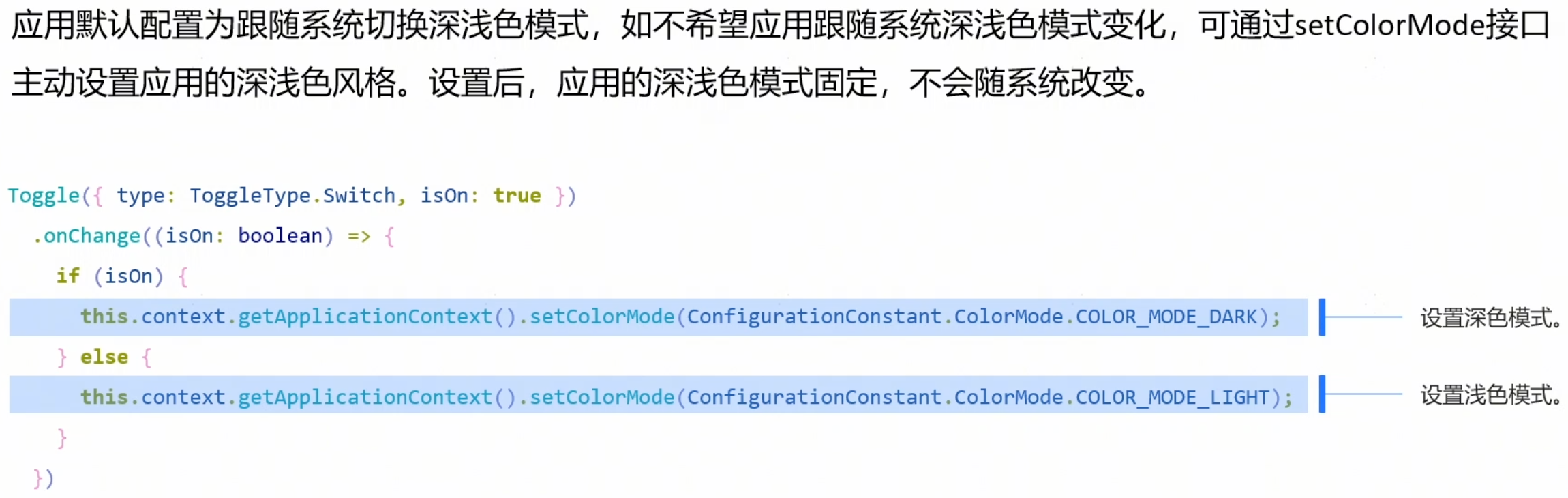 实现上,切换深色模式需要调用setColorMode()方法将ColorMode设置为COLOR_MODE_DARK(深色模式),切换浅色模式需要将ColorMode设置为COLOR_MODE_LIGHT(浅色模式),这样就可以完成对应用深浅色的手动控制。
